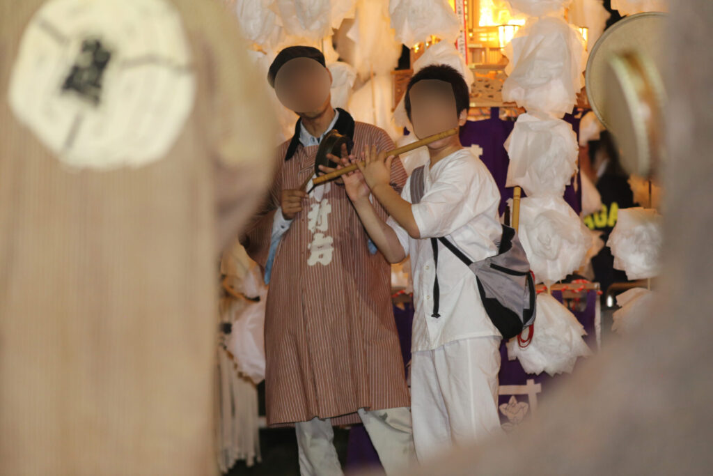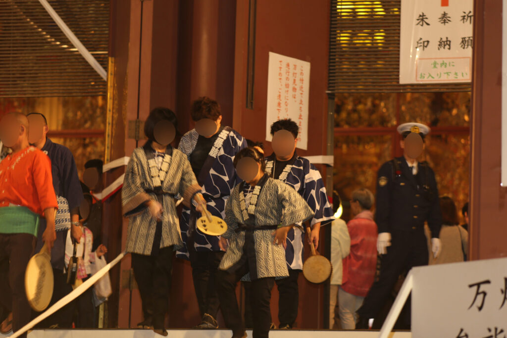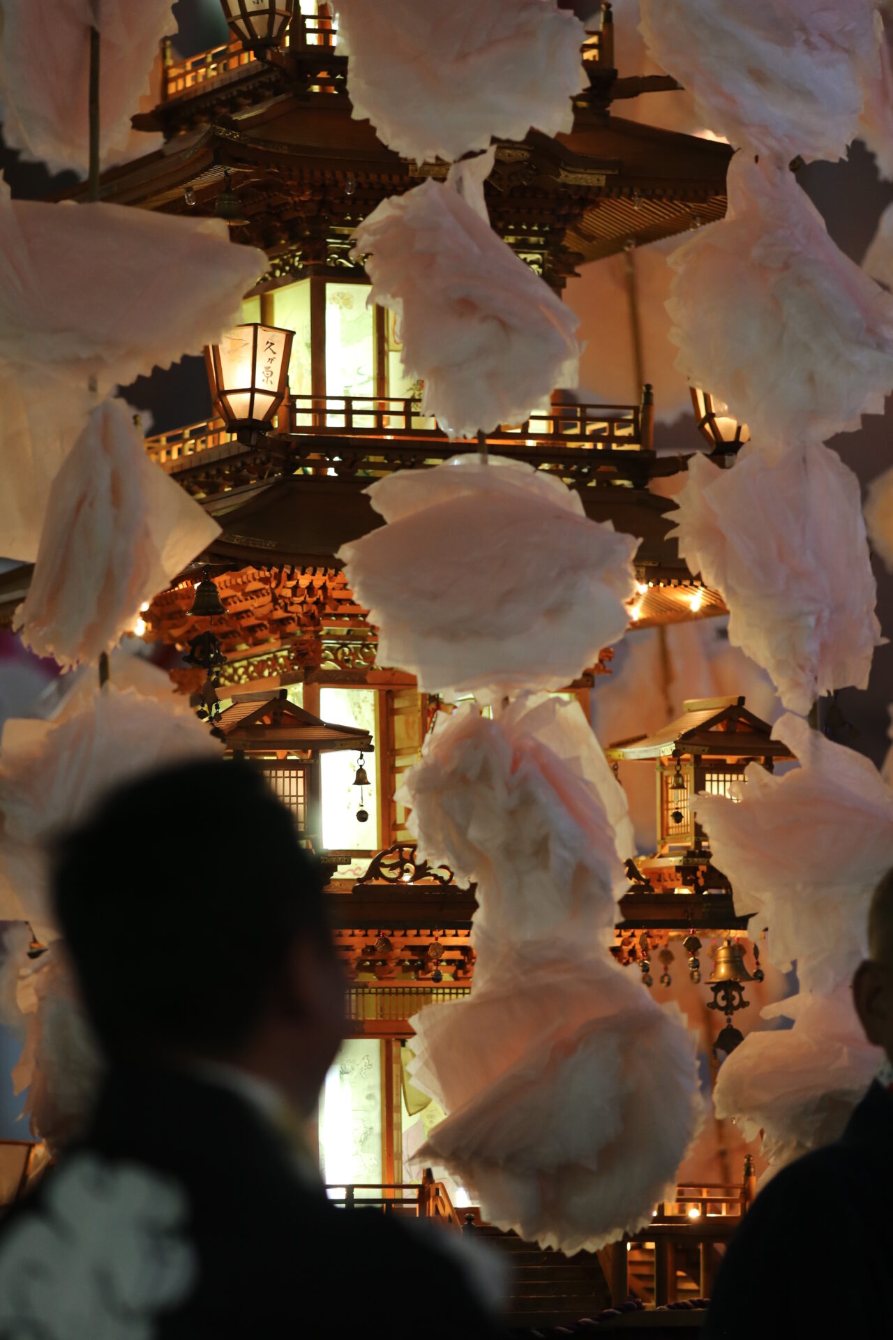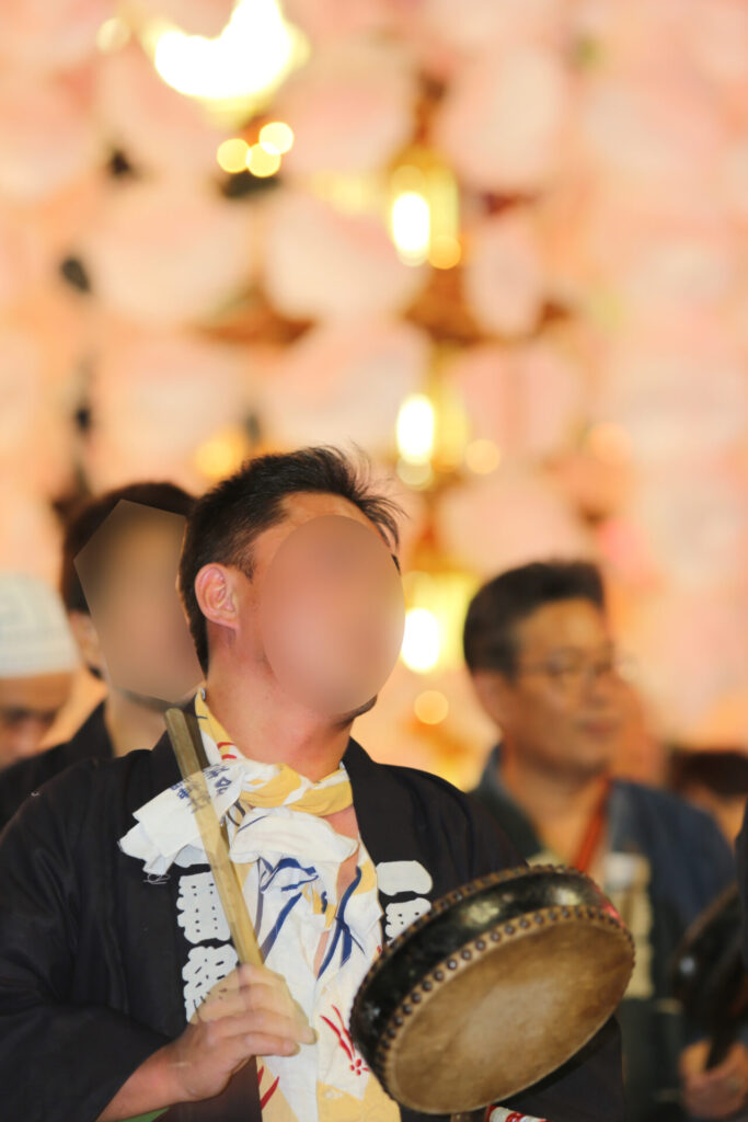 太鼓の音、纏(まとい)のリズム、そして幻想的に輝く万灯行列が参道を進んでいく光景は、まさに圧巻。
