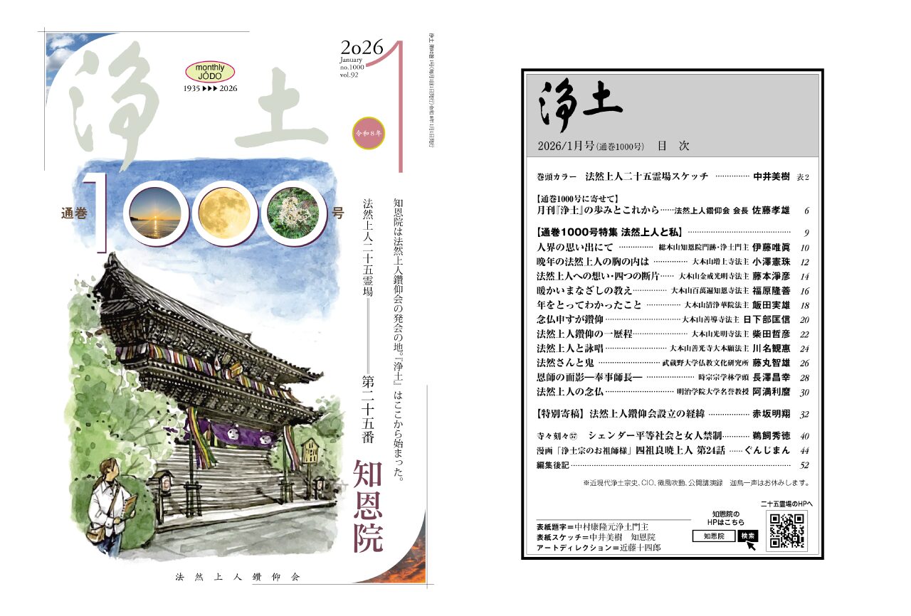 法然上人鑽仰会の会誌、月刊『浄土』は、お陰様にて本号で通巻一○○○号の節目を迎えることができました。一般書店に並ぶ商業誌でもない会誌がこれほどの号数を重ねてこられましたのは、ひとえに先達たちの情熱と会員各位のお力添えの賜物であり、感謝に堪えません。