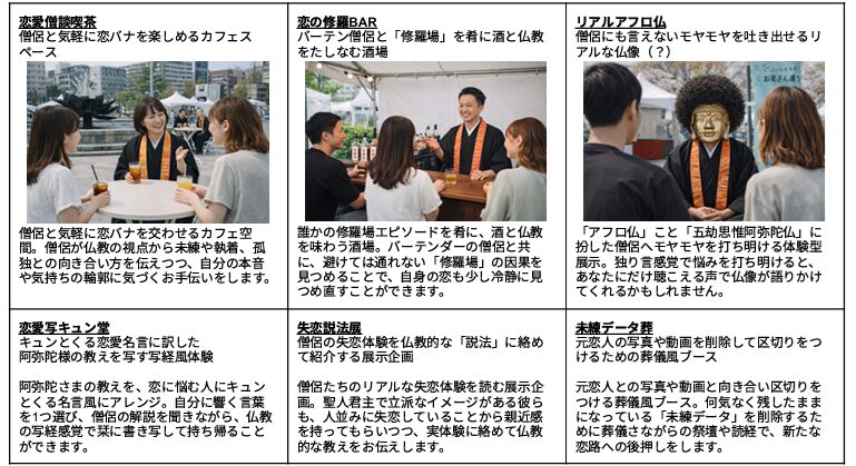 • 恋愛僧談喫茶: 喫茶スペースで、僧侶に気軽に恋の悩みを相談(僧談)。